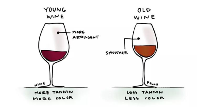 隨著葡萄酒的老化,顏色變得不那么強烈,非常古老的葡萄酒顏色蒼白,半透明。