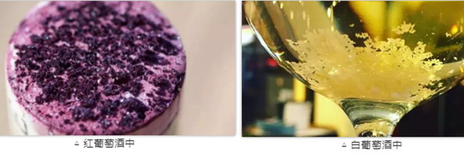 它們常會出現在與酒液接觸的橡木塞表面或瓶底,常被人們認為時葡萄酒變質的表現,但其實它們只是葡萄酒中的酒石酸與色素、單寧等酚類物質和礦物質結合形成大分子酒石酸鹽所造成的現象,并不影響酒的品質。