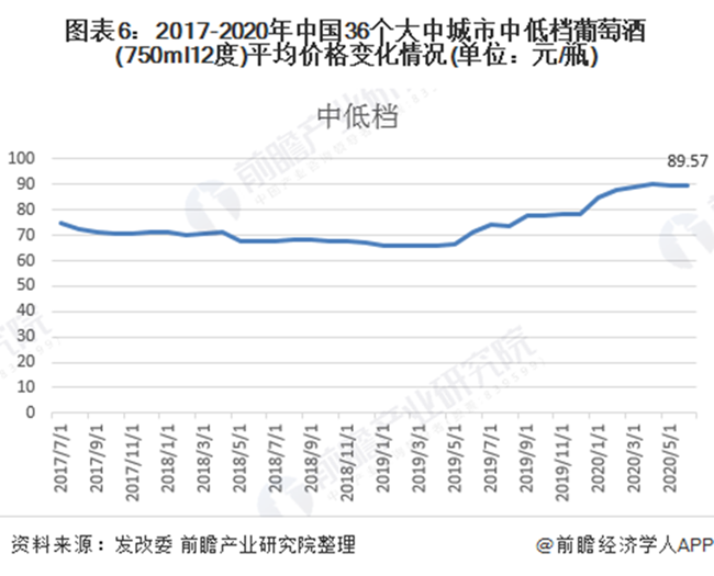 根據發改委披露的2017-2020年中國36個大中城市日用工業消費品平均價格來看,2017-2020年我國葡萄酒價格整體上呈現先下降后增長的態勢。其中高檔葡萄酒價格波動幅度略高于中低檔葡萄酒。截至2020年6月,我國高檔葡萄酒平均價格為364.85元/瓶,中低檔葡萄酒平均價格為89.75元/瓶。