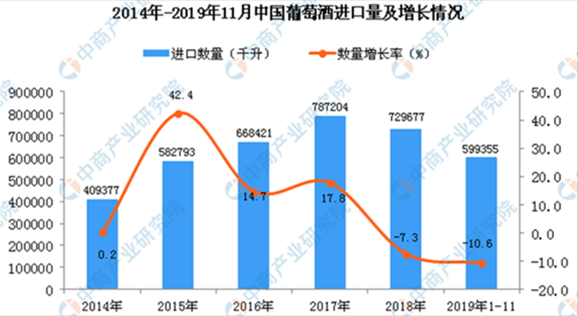 據中商產業(yè)研究院數據庫顯示,2014-2017年中國葡萄酒進口量逐漸增長,2018年中國葡萄酒進口量有所下降;2019年1-11月中國葡萄酒進口量為599355千升,同比下降10.6%。