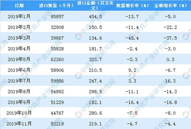 從金額方面來看,2019年1-11月中國葡萄酒進口金額為2207.9百萬美元,同比下降7%。